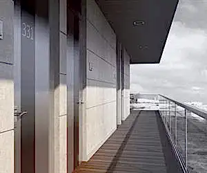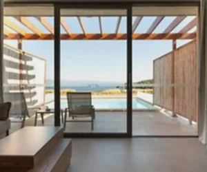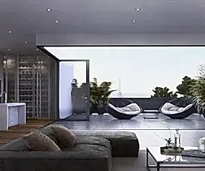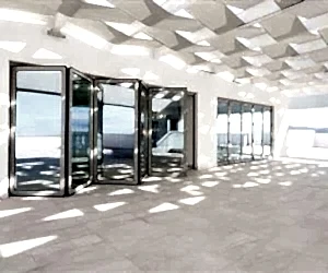 Oteller, modern evler ve ofis binaları gibi geleneksel yapılara ve büyük inşaatlara uygun üstten askılı, ısı yalıtımsız kayar-katlanır kapı sistemi.